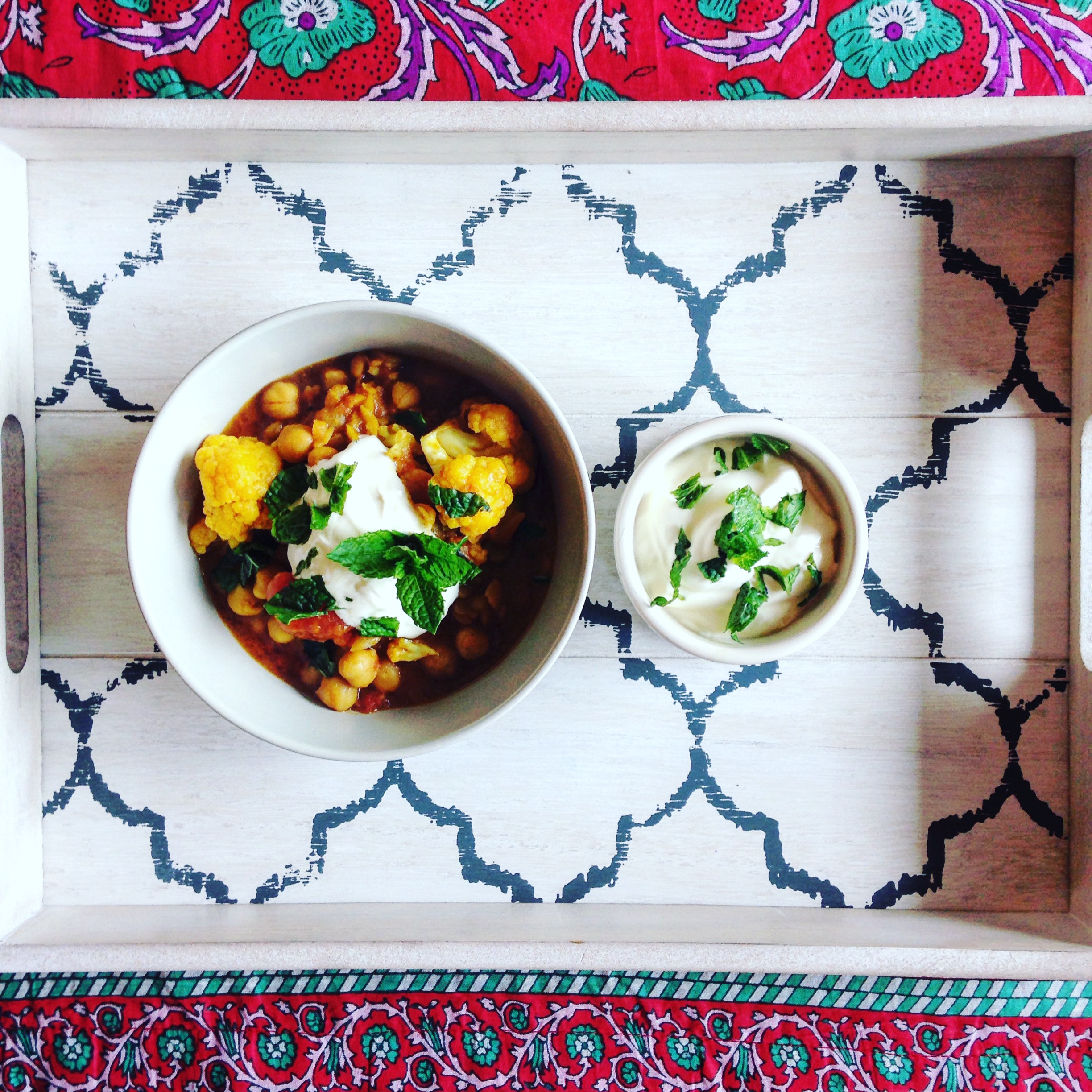 Homemade cauliflower, chickpea and coconut curry with CoYo yogurt, lime and fresh mint raita anyone? I can’t tell you how delicious this warming bowl of beautiful nourishment is. I also made some fragrant cardamom rice to go with it. It is the perfect winter warmer for these chilly nights now upon us. I especially love this recipe because it contains some seriously potent anti-inflammatory spices that will help those with sensitive skin in the colder weather. It is also a great immune system booster, fortifying it against those dastardly, ever-present winter bugs. Chickpeas are high in protein and thus are marvellous at facilitating and maintaining optimum metabolic function. I adore the mighty coconut, in all its guises. I am particularly fond of coconut milk, so I added a can of it to this curry to make it creamy and sumptuous. Coconuts contain a very special ingredient, Lauric Acid which can kill bacteria and help to stave-off infections. Combined with the spices, the final concoction is a nutritionally-balanced, health-enhancing, winter-warming thing of beauty.
