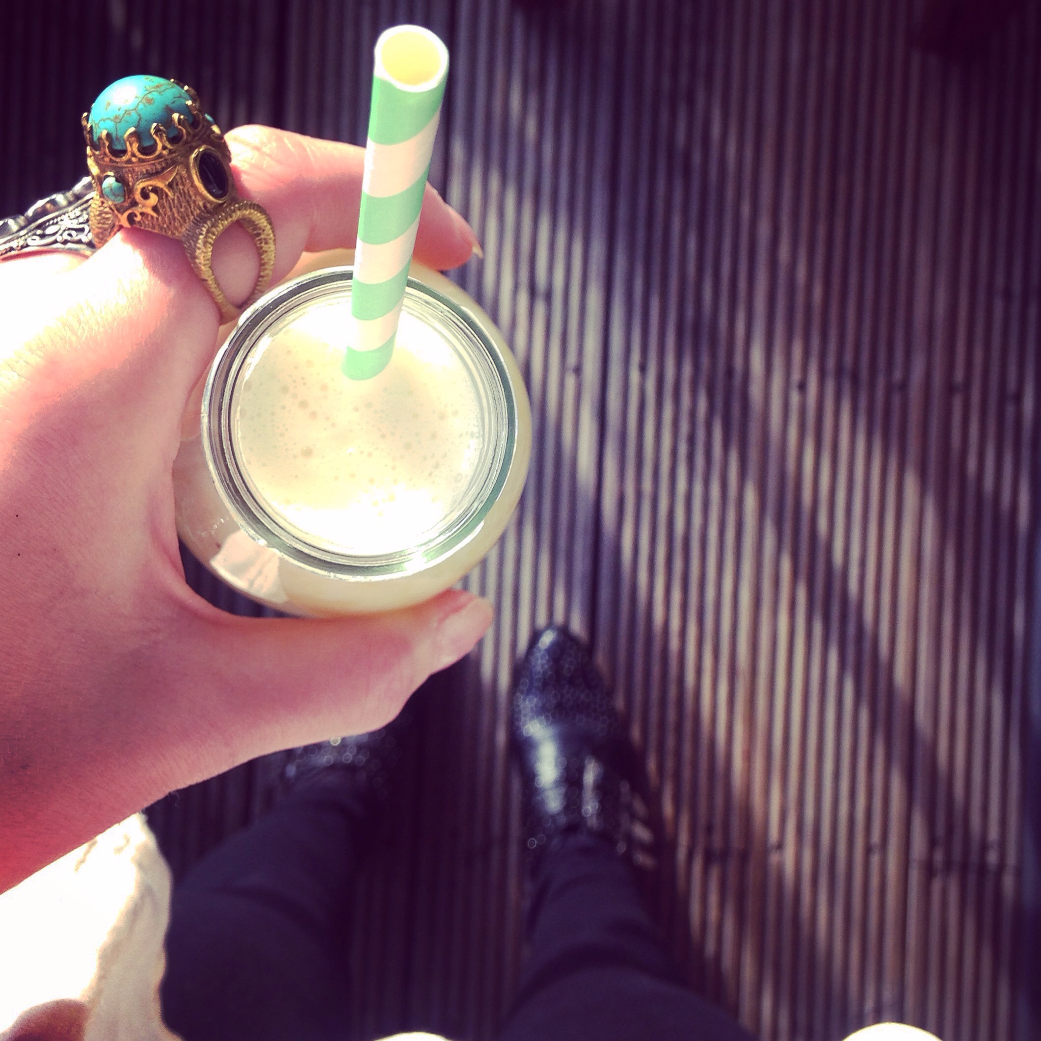 I blinkin love this smoothie soooo much!!! I chopped a juicy, ripe pineapple into chunks (froze half of it) and blended the other half with 1 x ripe mango, 1 x banana, a couple of dollops of coconut milk and a good glug of Vitacoco coconut water. I also added some cashew nuts (soaked for a few hours so that they are easier to blend)…Fanny’s your Aunt…..