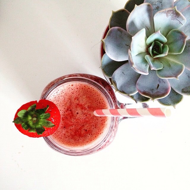 To make my sumptuous Sunrise Juice, you will need; strawberries, pomegranate, passionfruit, banana and coconut water. Blend until smooth and serve over crushed ice.