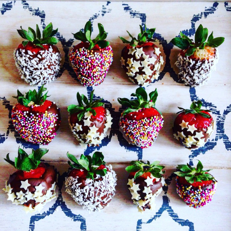 Simply melt some Green & Blacks milk chocolate, dunk your strawberries making sure that they’re evenly-covered then sprinkle with chocolate stars, hundreds and thousands and coconut.