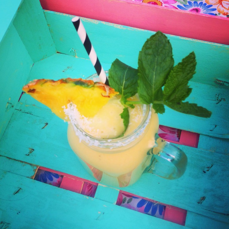 Peaches, pineapple, banana, almonds, coconut milk, coconut water, ice. Blend and serve over ice …..
