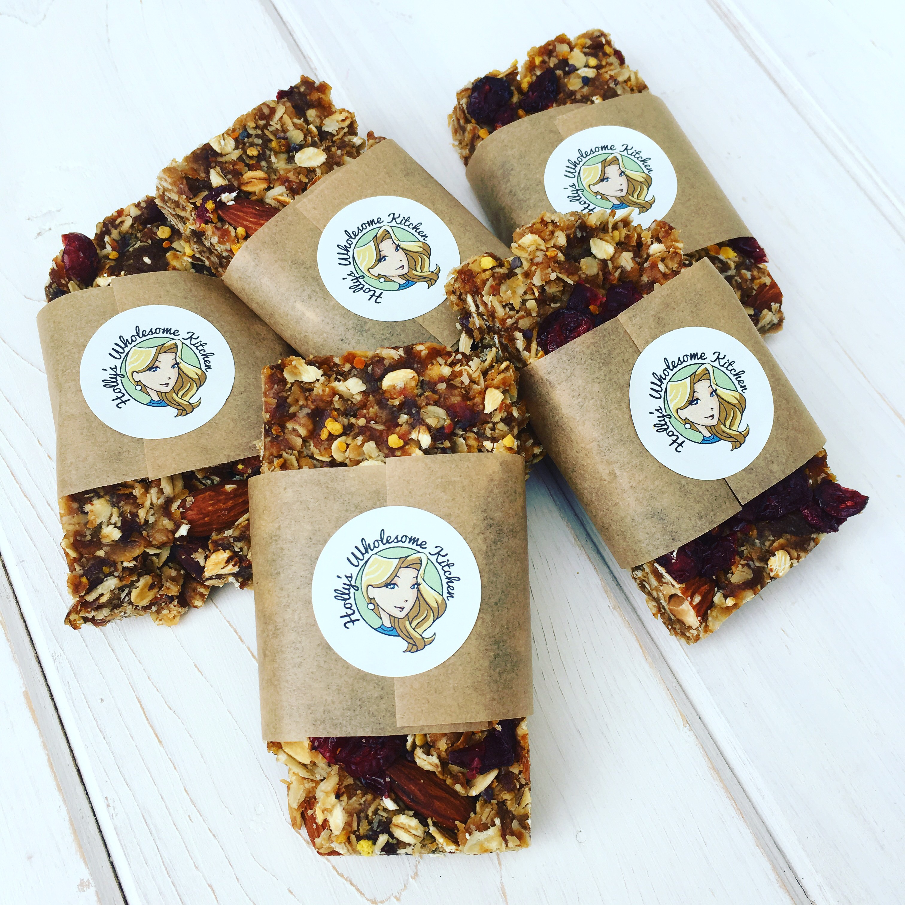 Shopping list: gluten-free oats (1.5 cups), almonds (1 cup), dried cranberries (half cup), dates (1 cup), nut butter (half cup), coconut nectar (half cup)…..whizz the dates in food processor, toast almonds and oats until dark gold, warm nut butter and nectar in a small pan, add all ingredients together and add cranberries. Line a square tin (20cm x 20cm) and push in mixture. Leave to cool and refrigerate for 1 hour. Cut into rectangles and eat!