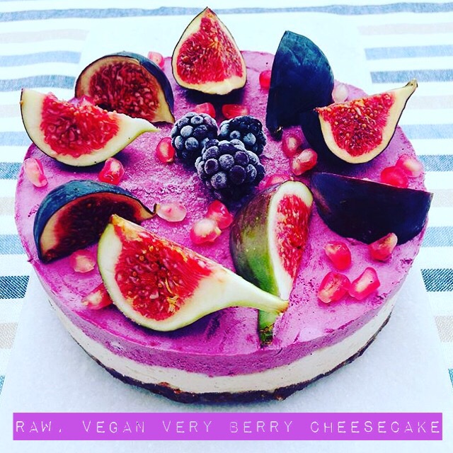 Method: 1. Cover cashews in water and leave to soak in fridge overnight, 2. Blend (in food processor) 3 cups of almonds, 3 cups of dates and half a cup of coconut nectar until in small chucks. Press mixture into cake tin (with push-up base) and refrigerate for an hour, 3. Drain soaked almonds, add juice of lemon and seeds from vanilla pods. Blend and divide into 2, 4. Add berries to one half and blend, 5. Add non-berry later then berry layer and refrigerate for 1 hour, 6. Adorn with cut fresh figs and pomegranate seeds xxx