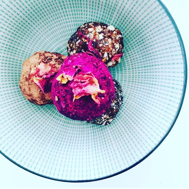 Method: Simple! Just food process all ingredients (except pitaya powder), roll mixture into balls and cover in vibrant pink pitaya πππ chill in fridge and serve! Rose petals optional.