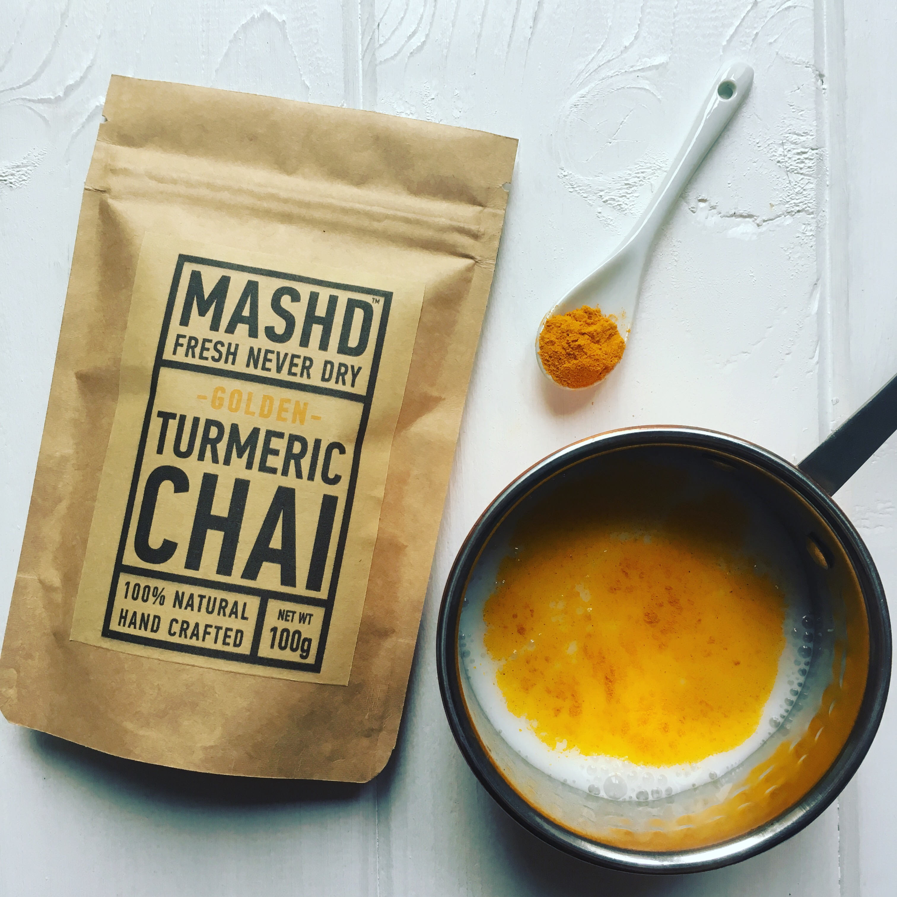 Mashd Golden Turmeric Chai has got it going on!!! Fresh, never dry, it is the BEST chai mix I have ever tried. Some hot almond mylk and a shaving of fresh turmeric to garnish and hey presto! A divine, healthy drink to warm your cockles!
