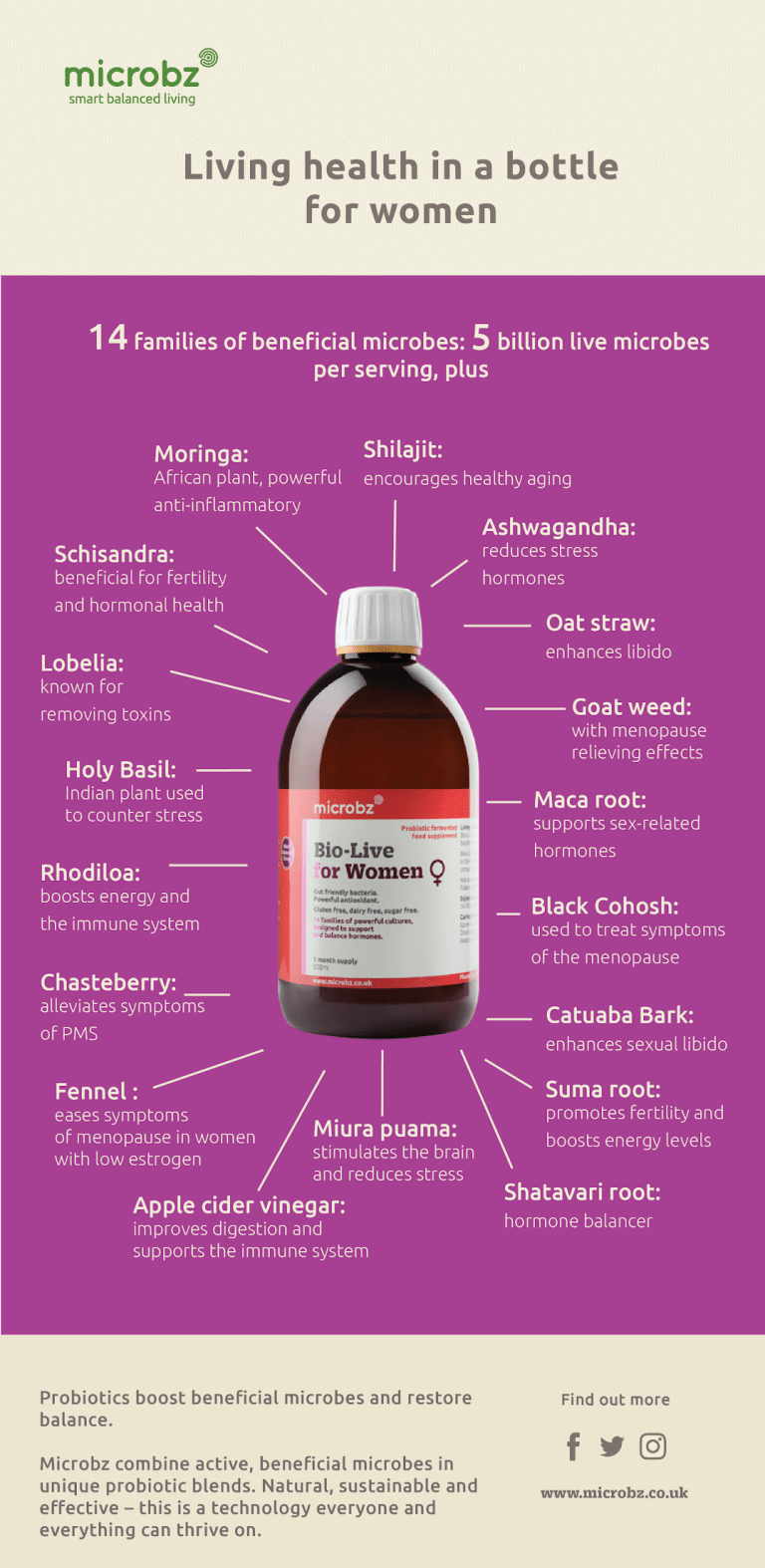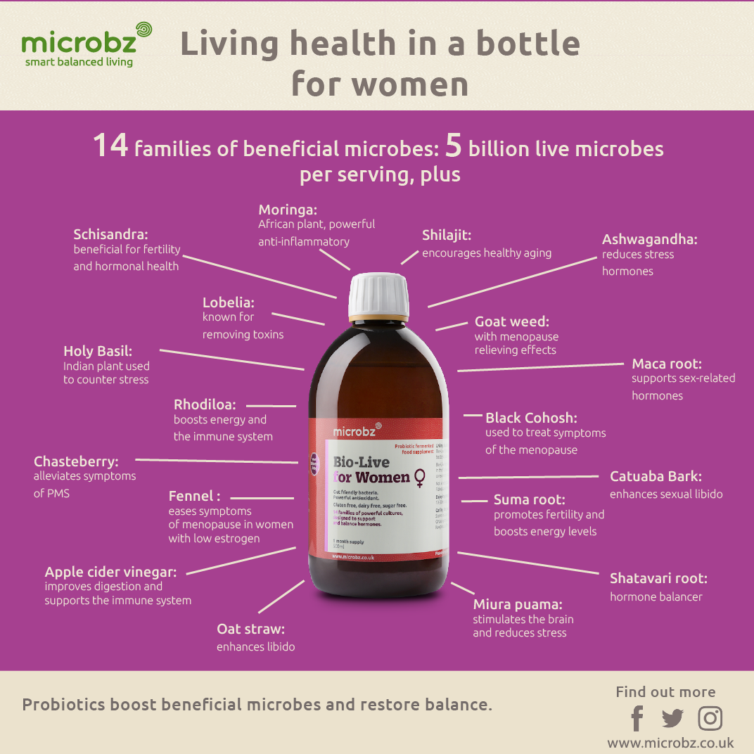 I have been taking the Microbz Bio-Live for women for 3 weeks and the results have been amazing. The 500ml bottle contains a 1-month (daily) supply and bursting with anti-oxidants. It’s also gluten, dairy and sugar free. How amazing is that!