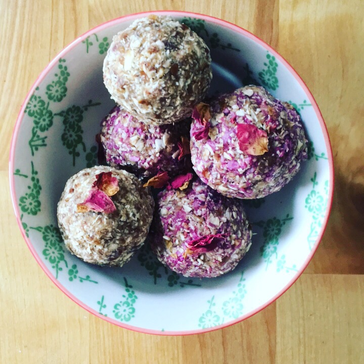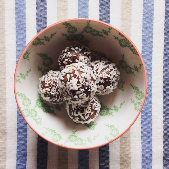 Fuel your body with these marvellous little bites of raw, energy-boosting goodness. Simply whizz together a handful each of walnuts and dates and roll in desiccated coconut. I also like to sprinkle with chopped pistachios or raw cacao powder. Store in an air-tight container in the fridge and enjoy whenever the mood takes you. They are the perfect balance of protein and fibre and the sticky, sugary loveliness of the dates satiates any sugar-craving (I should know).