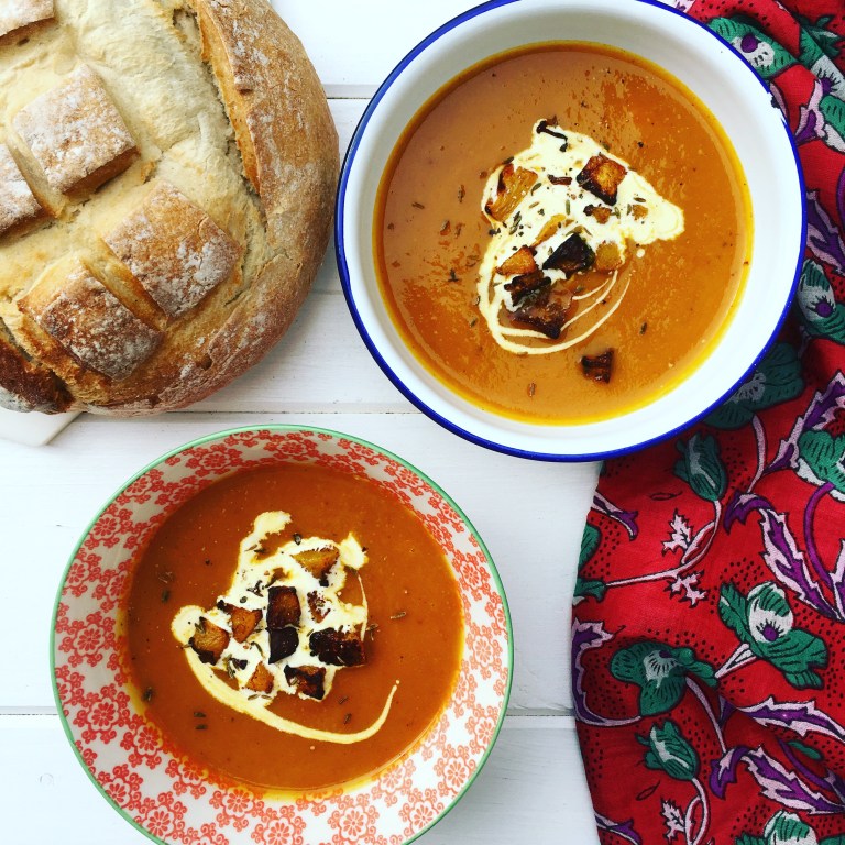 Method: Preheat oven to 180. Peel and cube all ingredients, cover with olive oil, paprika and salt & pepper. Roast until soft (with some golden bits – roughly 35 minutes and keep a few crispier ones aside for garnish). In a pan, slow-fry the chopped ginger and add 1.5 litres of stock. Add roasted veggies and bring to the boil. Take off the heat and blitz. Taste and add additional seasoning if required. Return to heat and simmer for a few minutes. Serve with a dollop of coconut yogurt, cubed squash and a sprinkling of cumin seeds. Sooooo yummy!